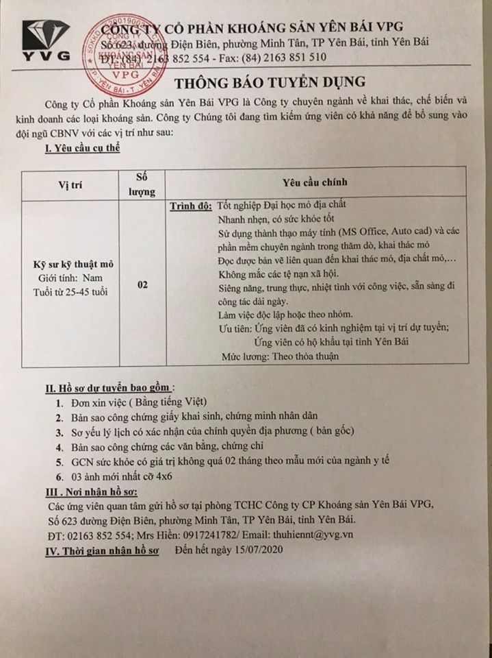 Công ty Cổ phần khoáng sản Yên Bái VPG có nhu cầu tuyển dụng Kỹ sư khai thác mỏ, mọi chi tiết xin vui lòng đọc thông báo dưới đây: